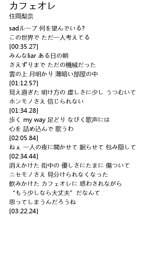 | [02:57.81] | 飲みかけた カフェオレに 惑わされながら |