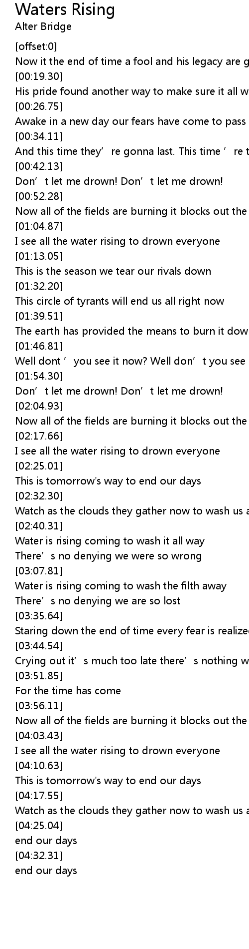 | [03:08.38] | Water is rising coming to wash the filth away |
