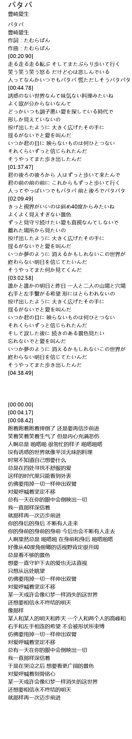 | [01:58.53] | 人ってやっぱいつでもパタパ 前と後ろでパタパタ |