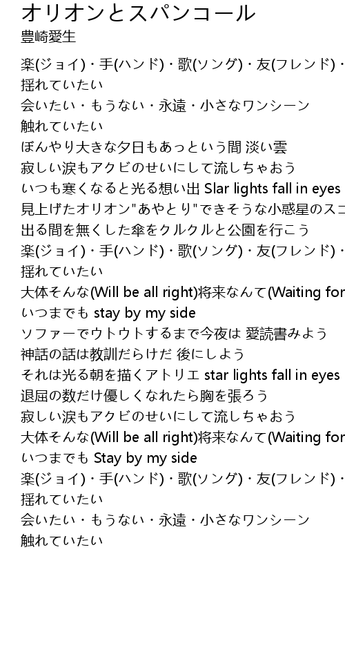 | 楽(ジョイ)・手(ハンド)・歌(ソング)・友(フレンド)・愛(ラブ)・哀(クライ)・音(ロック)・月(ムーン)・自(マイ)・生(ライフ) 揺れていたい | |