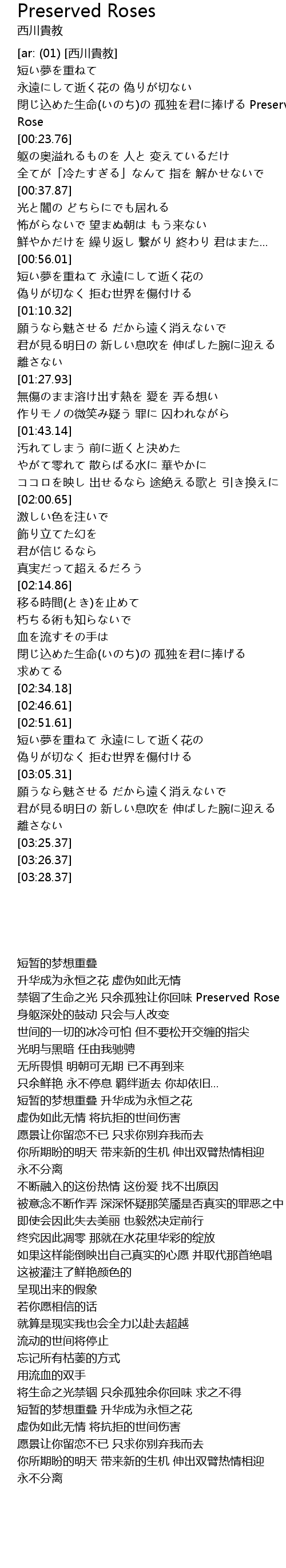 | [00:14.84] | 閉じ込めた生命(いのち)の 孤独を君に捧げる Preserved Rose |