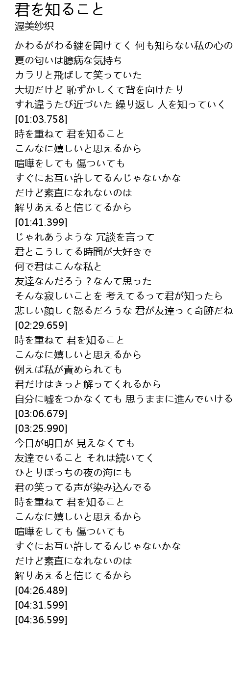 | [01:04.438] | 時を重ねて 君を知ること こんなに嬉しいと思えるから |