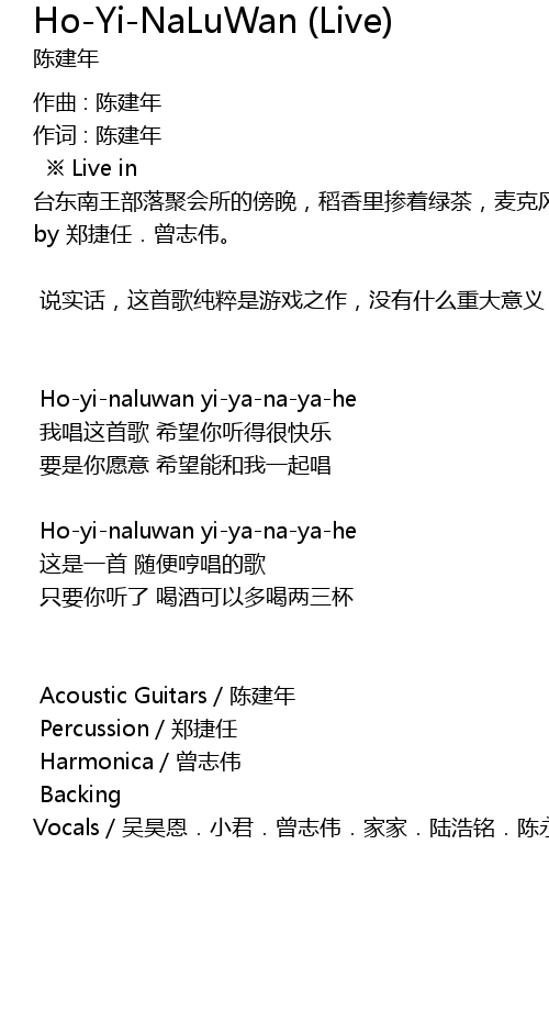 | 说实话,这首歌纯粹是游戏之作,没有什么重大意义,不过在吉他在诠释部份,倒是参考了相当多郭明龙(龙哥)独特的弹奏技巧。谈到龙哥我忍不住要说,他实在是我所见过原住民吉他手中的第一把交椅,遗憾的事后来龙哥因为出车祸的关系,不能再弹奏了,我们这群朋友都深表惋惜。 | |