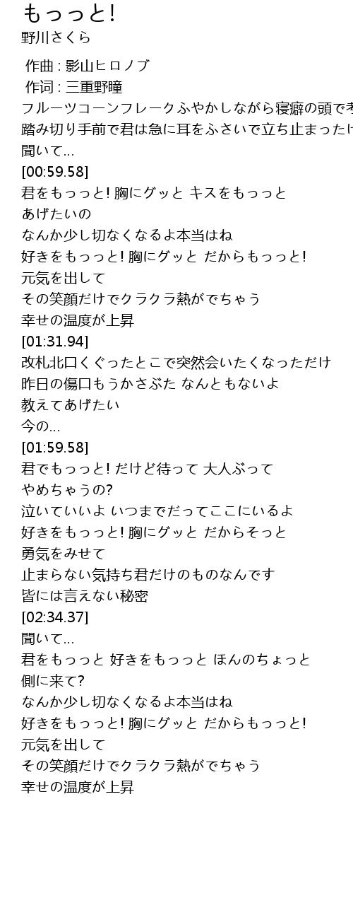 | [01:00.04] | 君をもっっと! 胸にグッと キスをもっっと あげたいの |