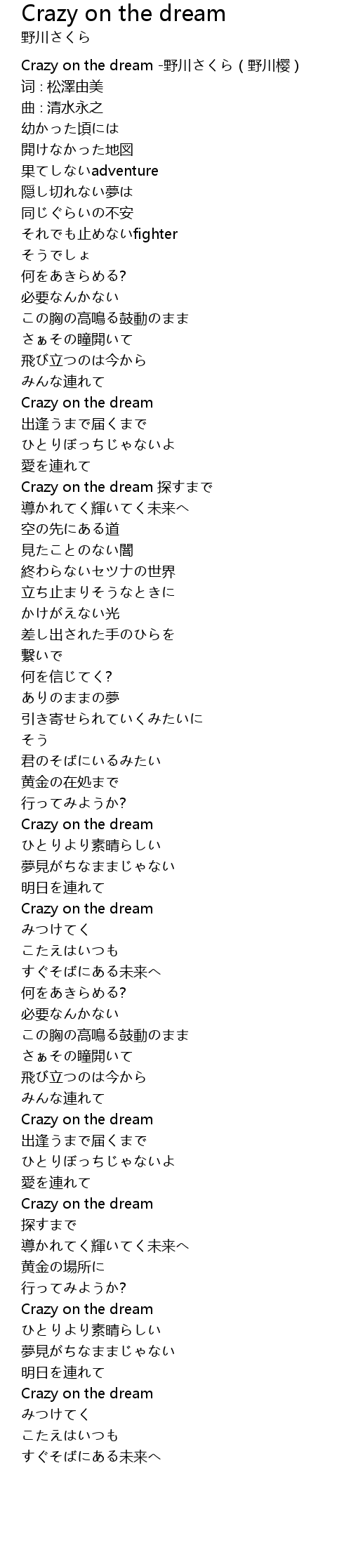 | [00:00.00] | Crazy on the dream -野川さくら(野川樱) |