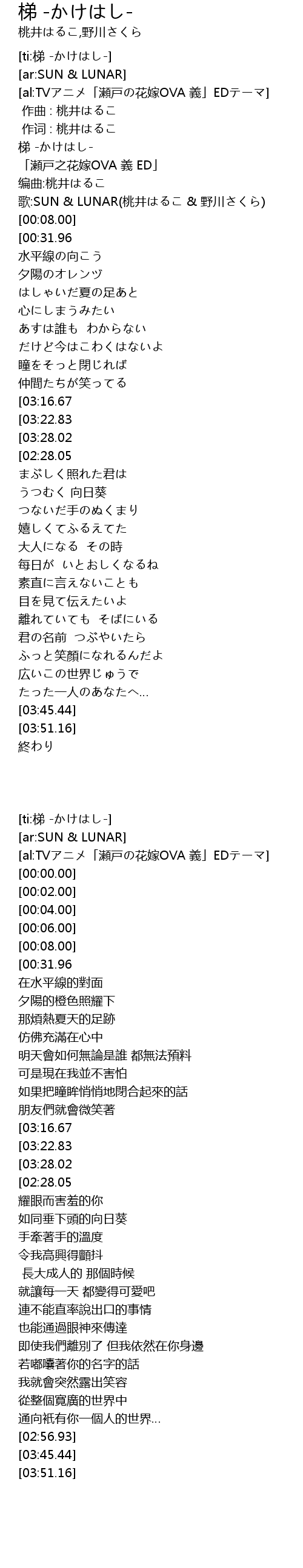 | [00:06.00] | 歌:SUN & LUNAR(桃井はるこ & 野川さくら) |