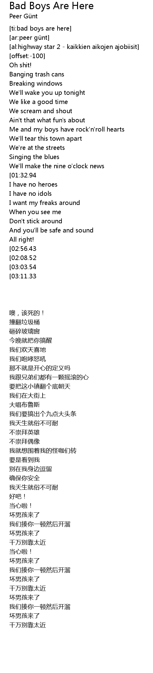 | [02:00.66][02:08.52][02:58.02][03:06.06][03:14.50][03:21.82] | Bad boys are here |