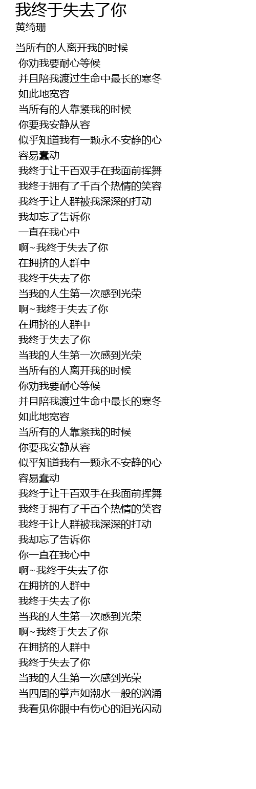 | [01:44.600] | a wǒ zhōng yú shī qù le nǐ |
