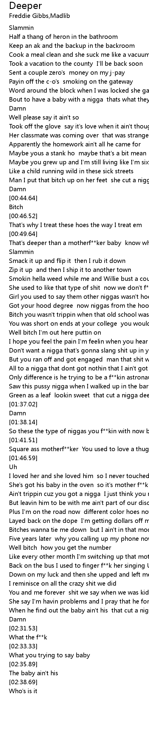 | [00:51.52] | That's deeper than a motherf**ker baby know what I'm sayin |