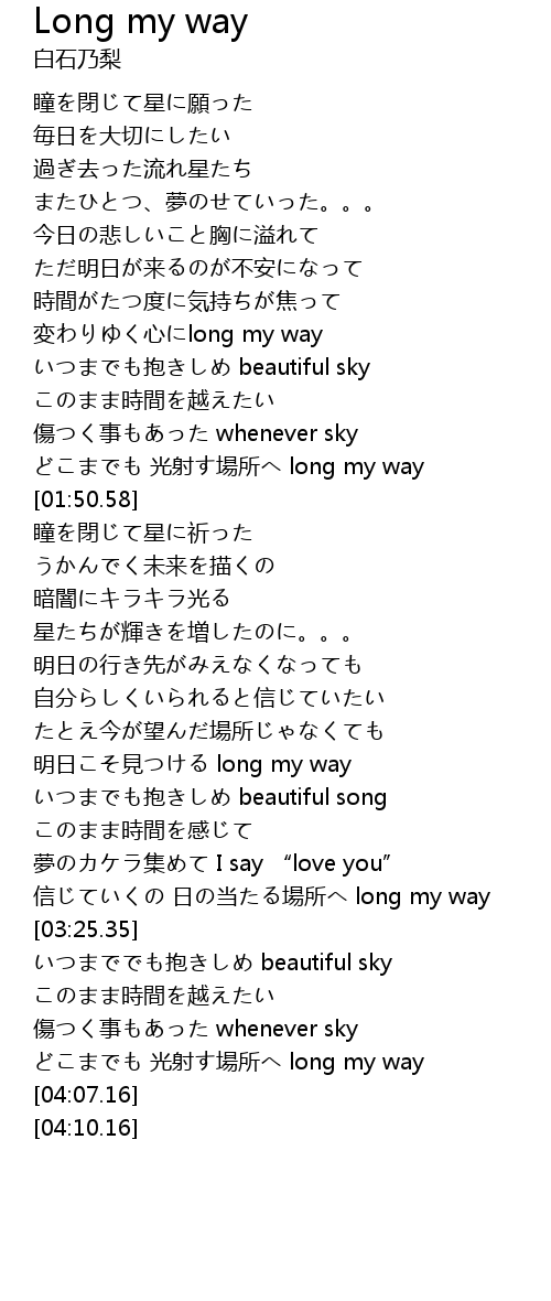 | [01:20.67] | いつまでも抱きしめ beautiful sky |