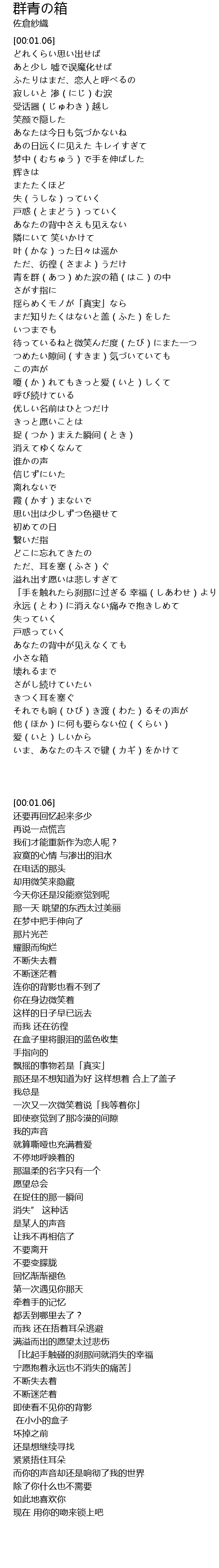 | [01:10.16] | 青を群(あつ)めた涙の箱(はこ)の中 |