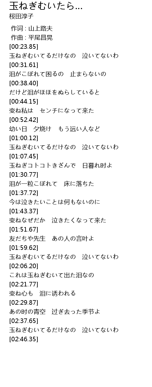 | [01:59.62] | 玉ねぎむいてるだけなの 泣いてないわ |