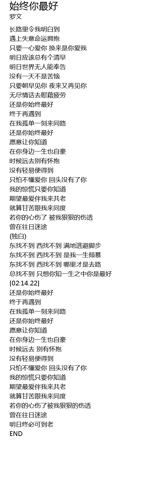 | [02:19.62] | hái shì nǐ shǐ zhōng zuì hǎo |
