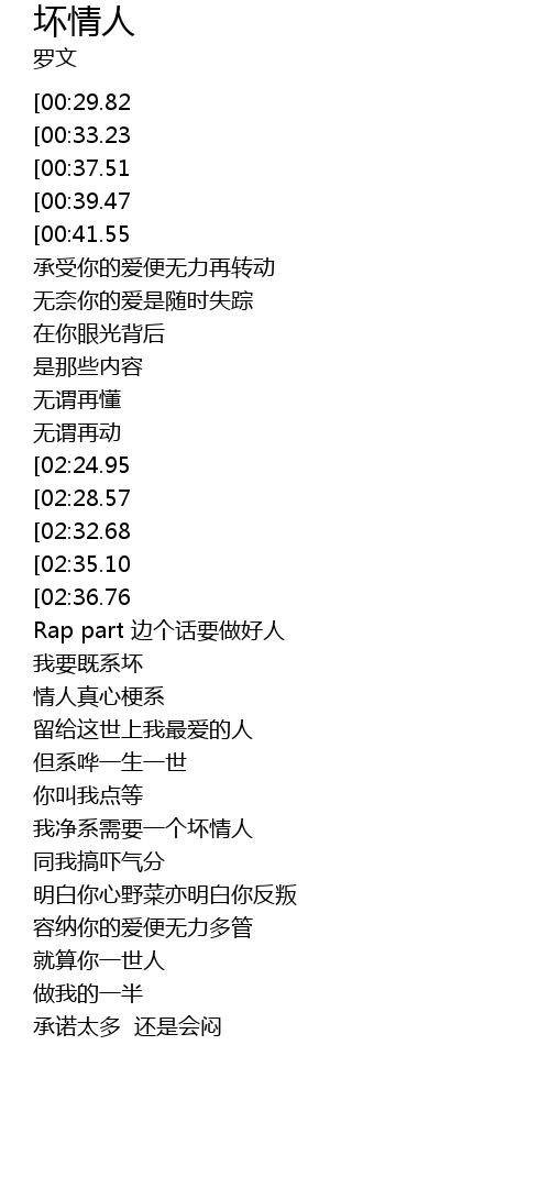 | [02:41.48][02:24.95][01:02.03] | 只想要坏情人 |
