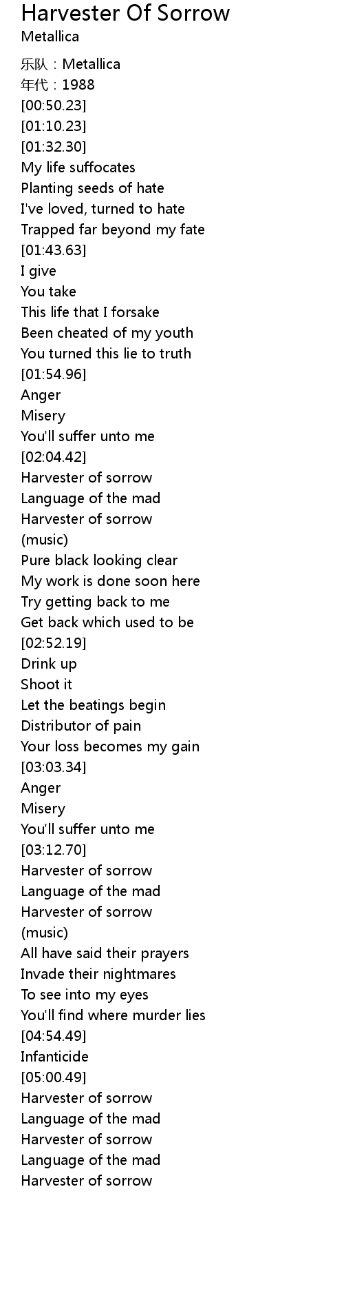 | [05:04.51] | Harvester of sorrow |
