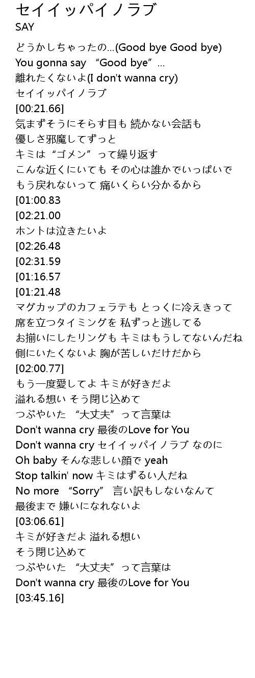 | [03:39.45][01:16.57] | Don't wanna cry セイイッパイノラブ |