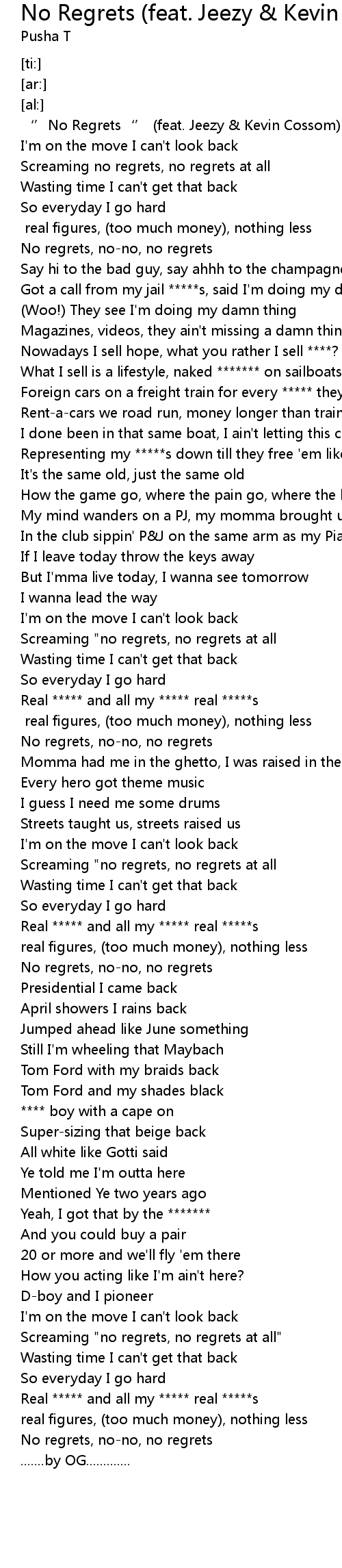 | [00:00.00] | '' No Regrets'' feat. Jeezy Kevin Cossom |