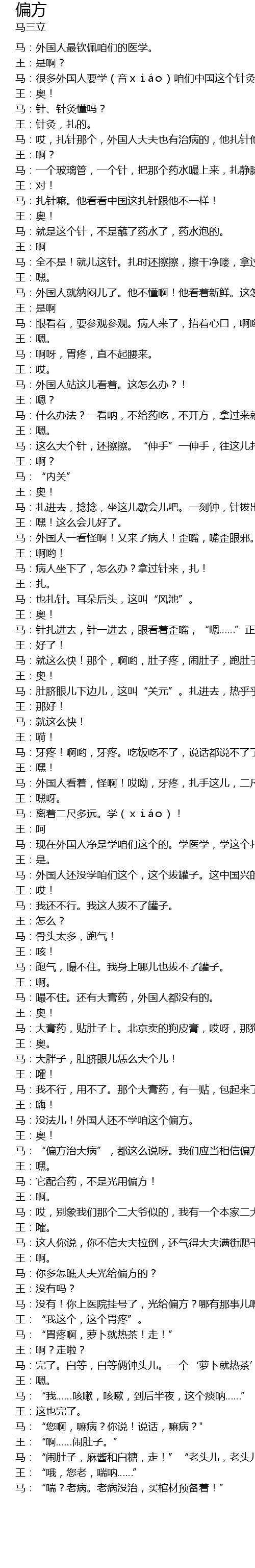| 马:“偏方治大病”,都这么说呀。我们应当相信偏方,但是我们也不能完全净信偏方。必须要听大夫的话。大夫给你偏方,我们要听:给你副药,告诉你了,黄酒,黄酒送下。这是偏方。偏方配合着药。你这个药啊,七个枣儿;你这个药啊,来点儿山楂片儿;你这个药啊,切三片儿姜。 | |