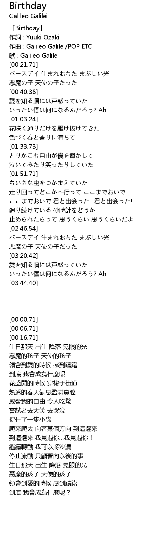 | [00:26.71] | バースデイ 生まれおちた まぶしい光 |