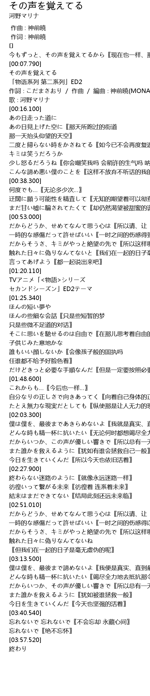 | [00:00.220] | 今もずっと、その声を覚えてるから〖现在也一样、那声音依旧回响于心中〗 |