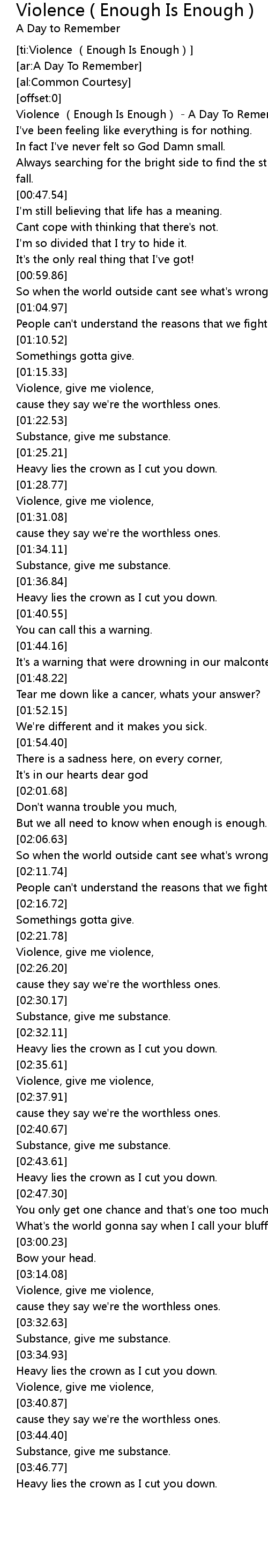 | [00:02.07] | Violence Enough Is Enough A Day To Remember |
