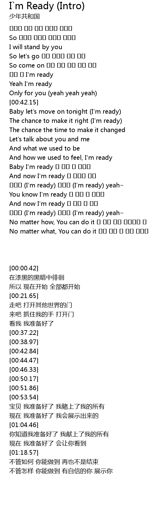 | [01:04.46] | 우우우 (I'm ready) 우우우 (I'm ready) yeah~ |