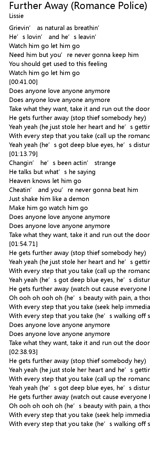 | [03:55.31] | He gets further away (watch out cause everyone knows) |