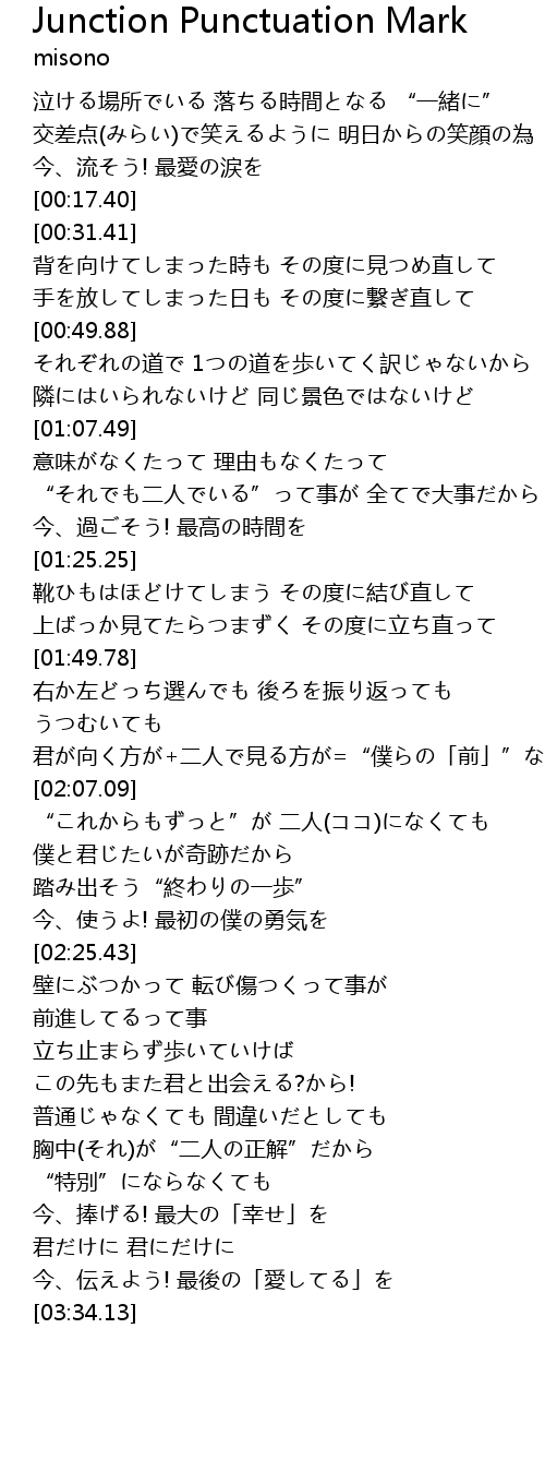 | [03:08.59] | 普通じゃなくても 間違いだとしても 胸中(それ)が“二人の正解”だから |