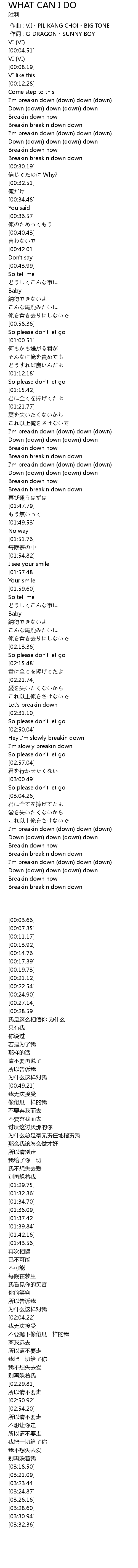 | [00:00.00] | 作曲 : V.I・PIL KANG CHOI・BIG TONE |
