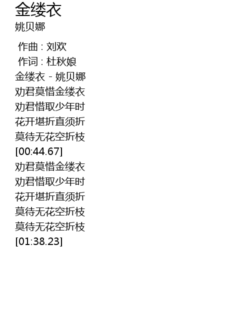 | [00:00.96] | 金缕衣 - 姚贝娜 |
