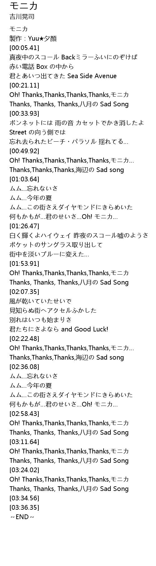 | [01:55.06] | Oh! Thanks,Thanks,Thanks,Thanks,モニカ |