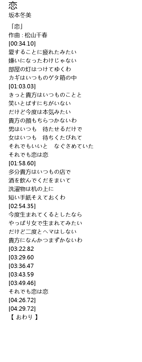 | [03:57.45][03:29.60] | 女はいつも 待ちくたびれて |