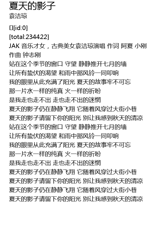 | [02:33.398] | 是我走也走不出 走也走不出的迷惘 夏天的影子仍在静静飞翔 它随着风穿过大街小巷 |