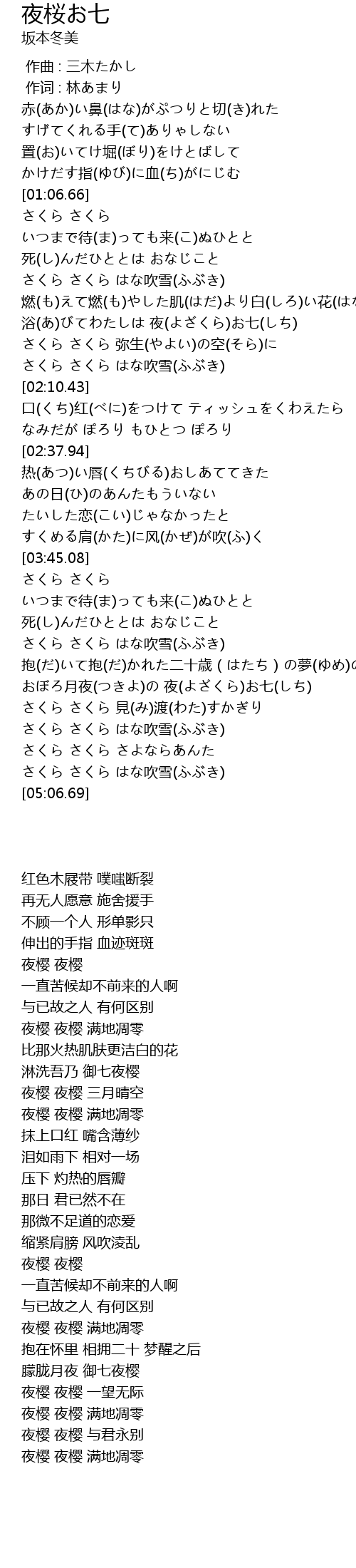 | [04:22.66] | おぼろ月夜(つきよ)の 夜(よざくら)お七(しち) |