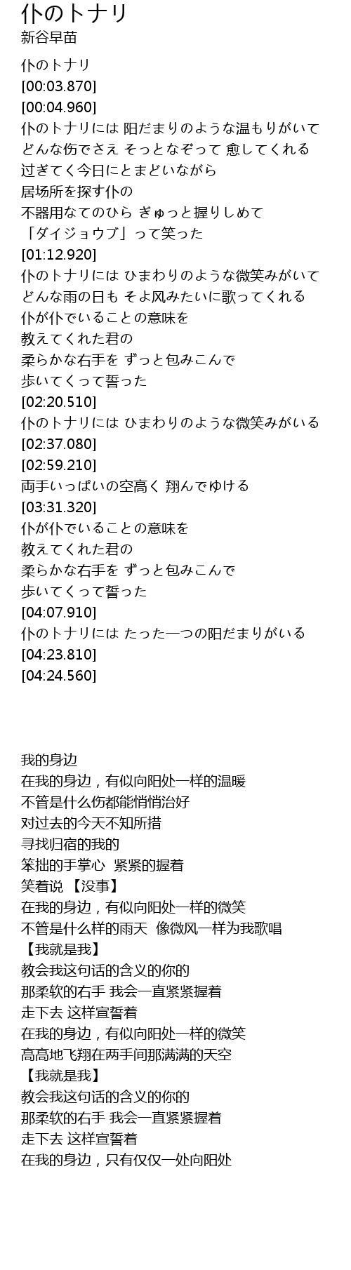 | [04:10.440] | 仆のトナリには たった一つの阳だまりがいる |