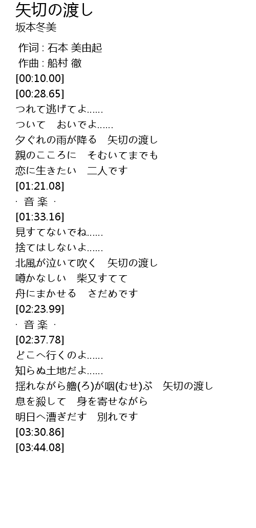 | [00:43.37] | 夕ぐれの雨が降る 矢切の渡し |