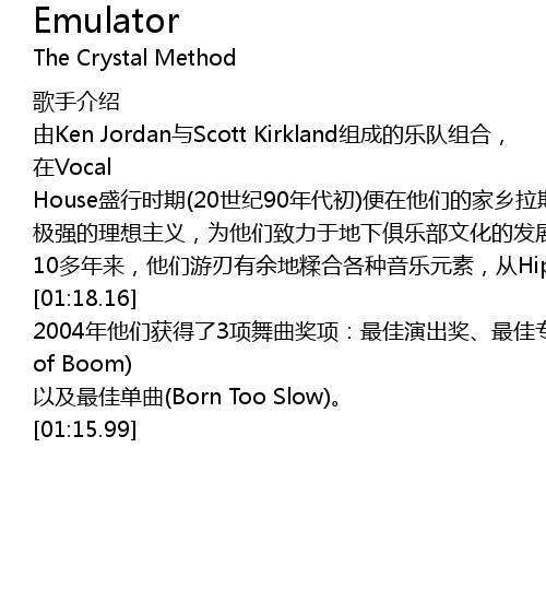| [00:44.22] | 在Vocal House盛行时期(20世纪90年代初)便在他们的家乡拉斯维加斯崭露头角。 |