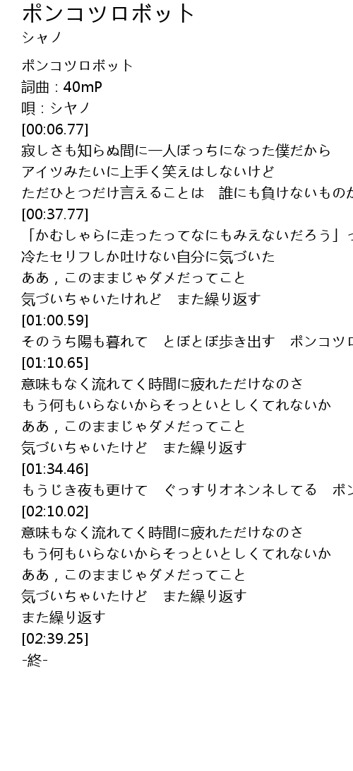 | [01:00.98] | そのうち陽も暮れて とぼとぼ歩き出す ポンコツロボット |