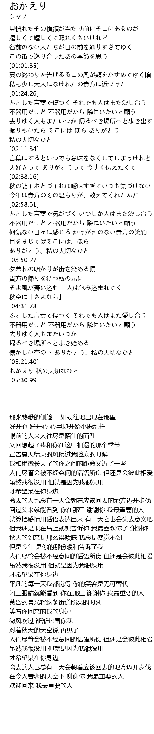 | [01:57.39] | 振りもいたら そこには ほら ありがとう 私の大切なひと |