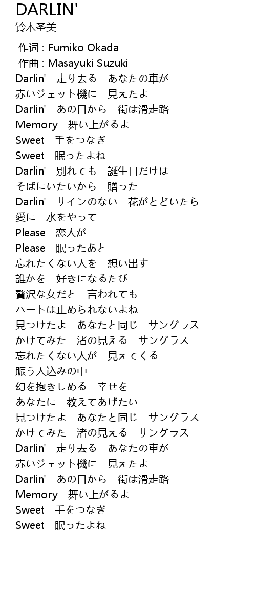 | [00:13.277] | Darlin' 走り去る あなたの車が |