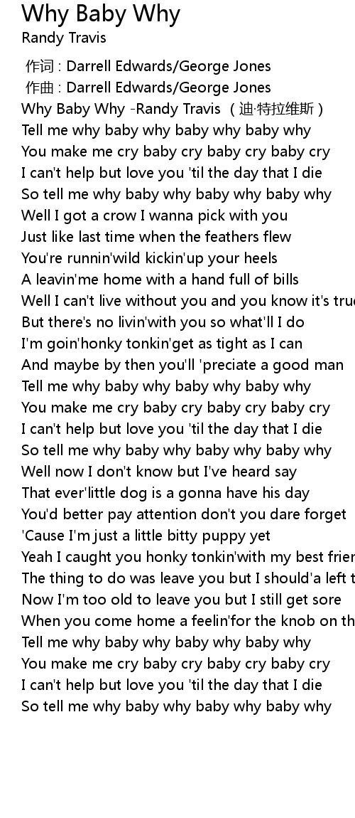 | [00:00.00] | Why Baby Why -Randy Travis (迪·特拉维斯) |