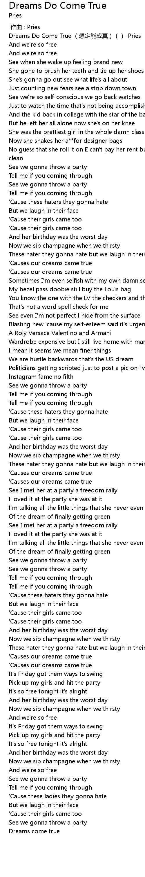 | [00:00.00] | Dreams Do Come True xiǎng dìng néng chéng zhēn Pries |