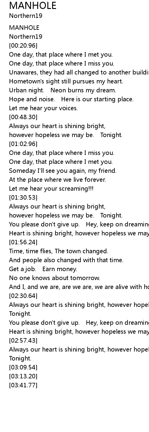 | [02:48.37] | Heart is shining bright, however hopeless we may be. Tonight. |