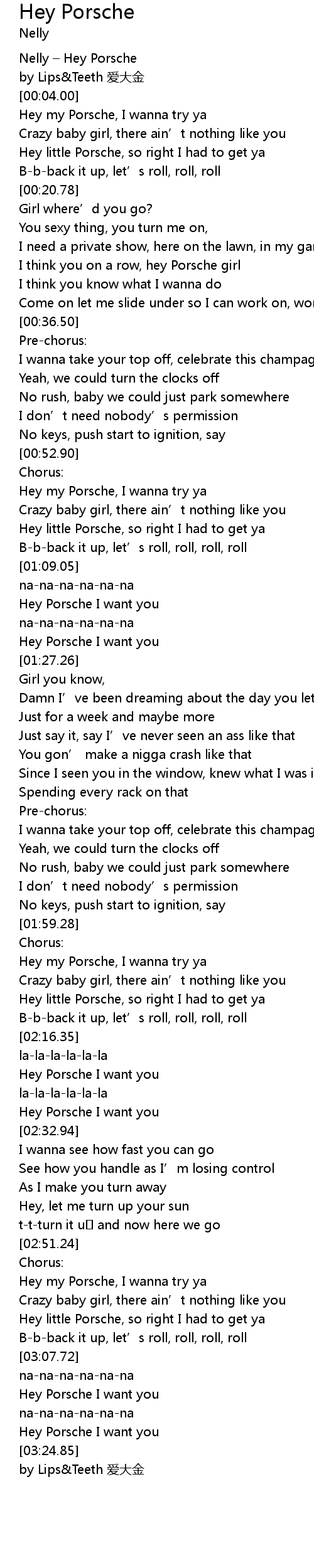 | [00:01.25] | Nelly Hey Porsche |