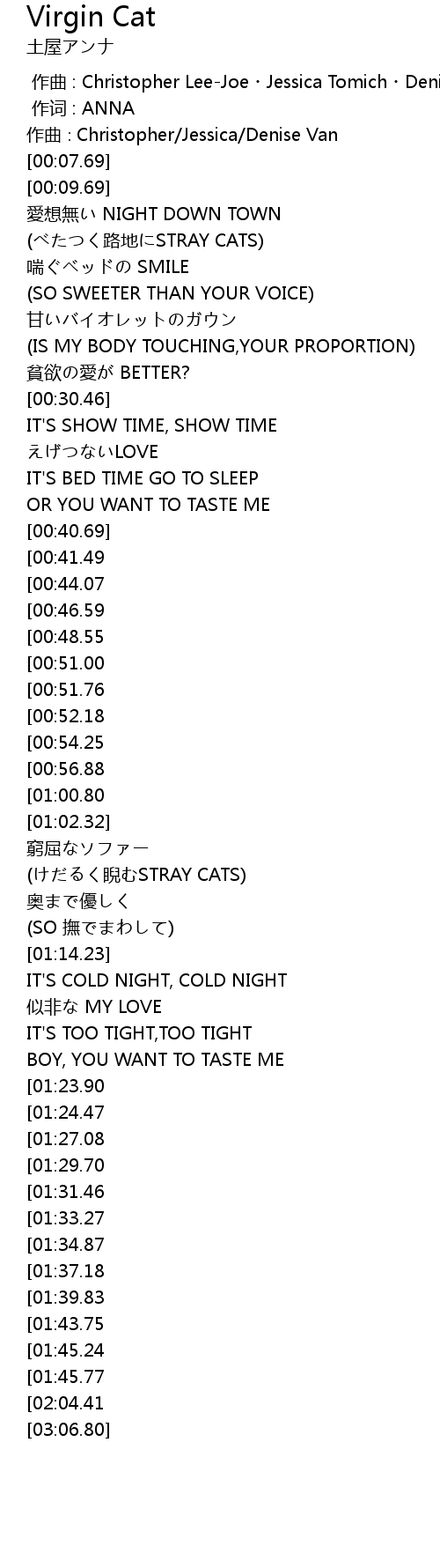 | [02:35.51][01:34.87] | Virgin Cat |