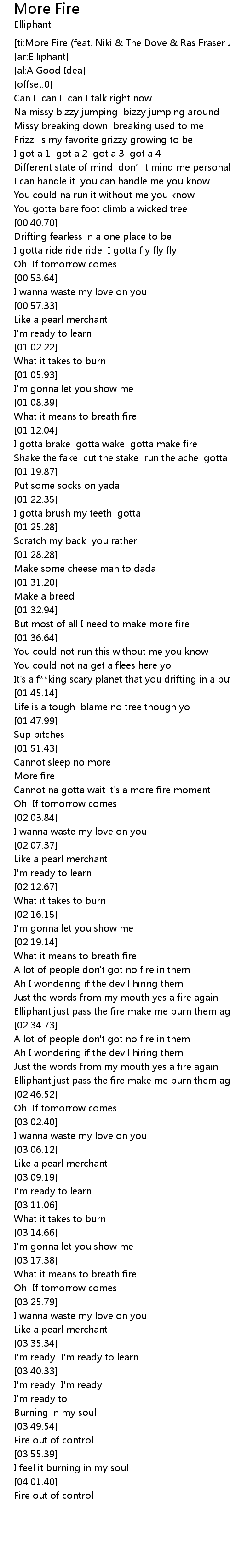 | [02:32.12] | Elliphant just pass the fire make me burn them again |