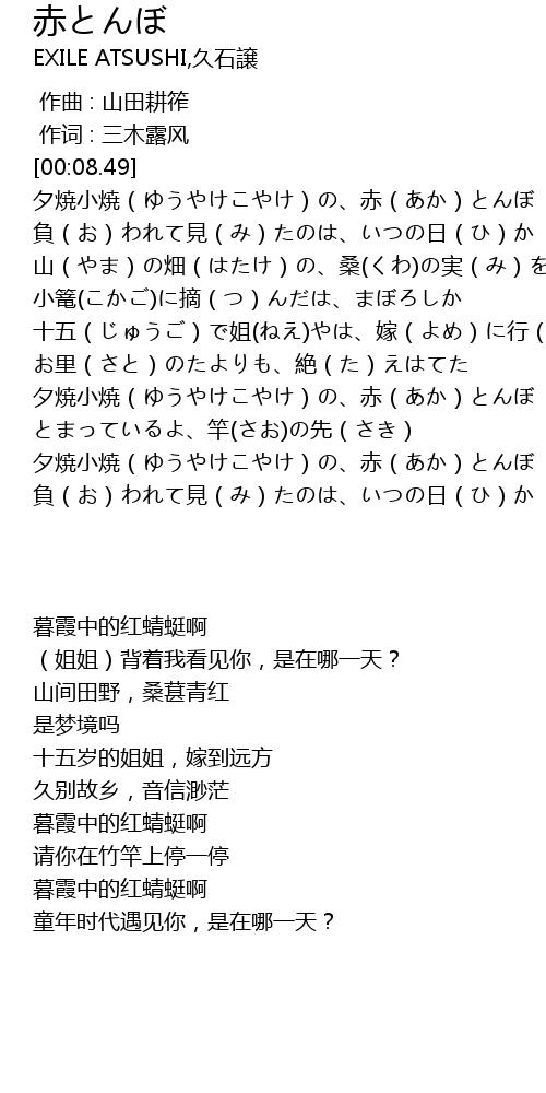 | [01:53.86] | 夕焼小焼(ゆうやけこやけ)の、赤(あか)とんぼ |