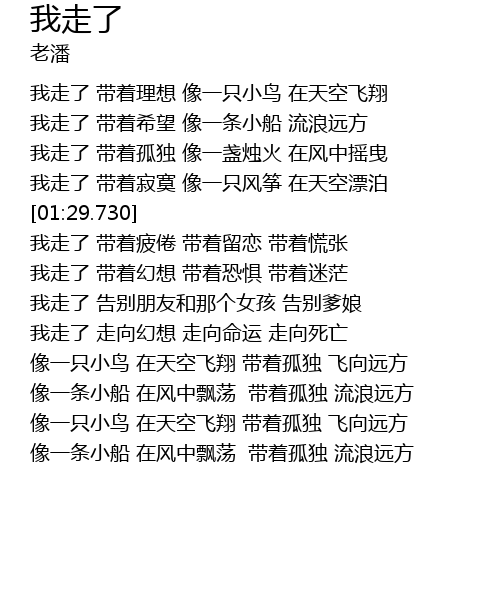 | [00:29.810] | 我走了 带着理想 像一只小鸟 在天空飞翔 |