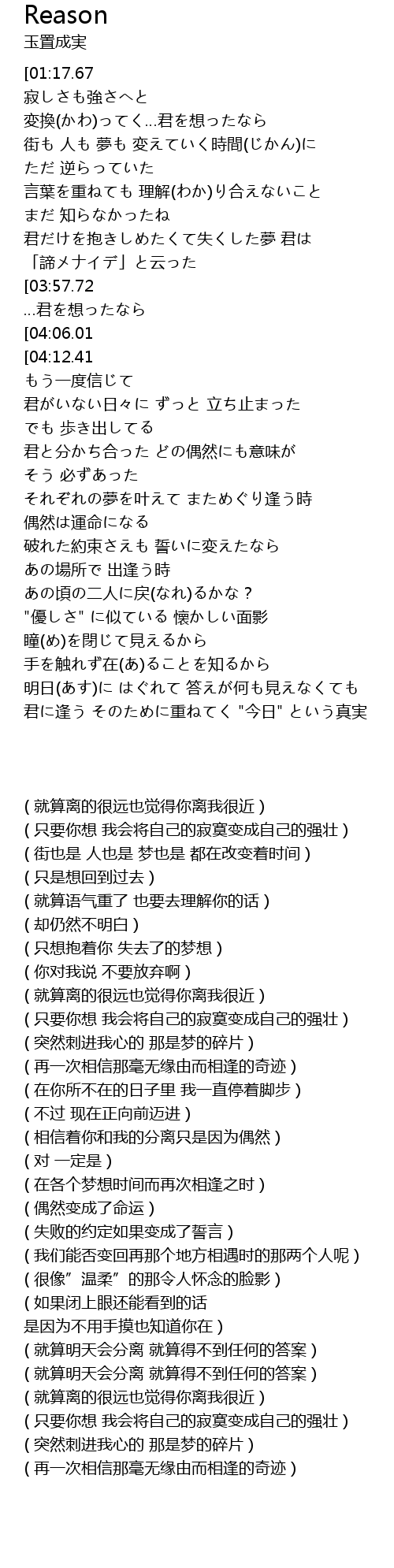 | [01:39.30][04:12.41] | ありのまま出逢えてた その奇跡 もう一度信じて |