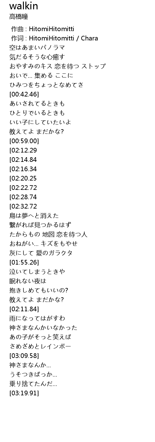| [00:01.00] | 作词 : HitomiHitomitti / Chara |